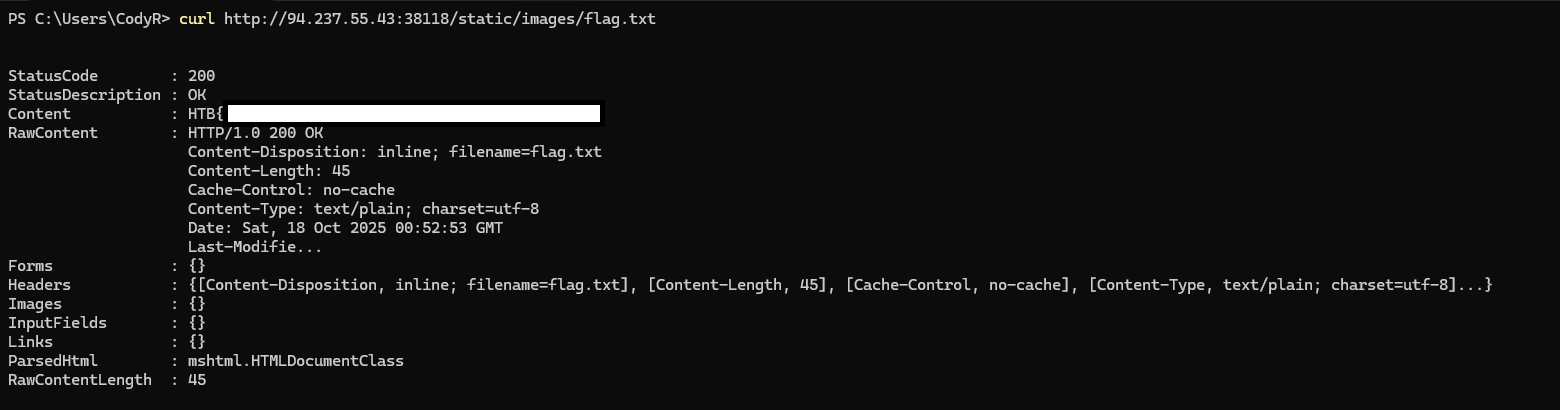 It looks like we get the same null response...or is it? If we run a curl on /static/images location with flag.txt we see in the Content the flag for the challenge