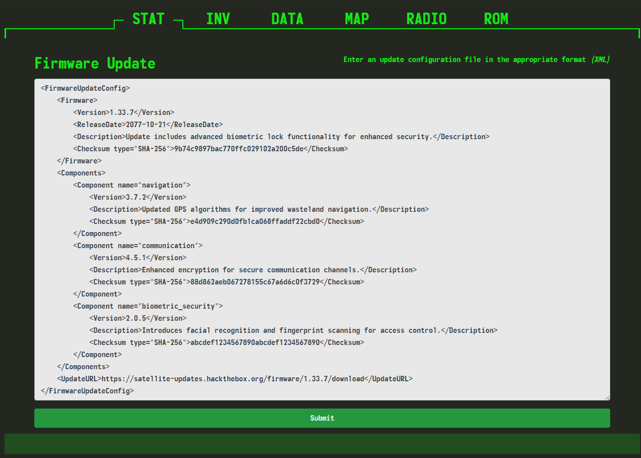 While the INV, DATA, MAP, and RADIO pages draw blanks the ROM page provides us with what looks to be a terminal, with some firmware update information in XML.